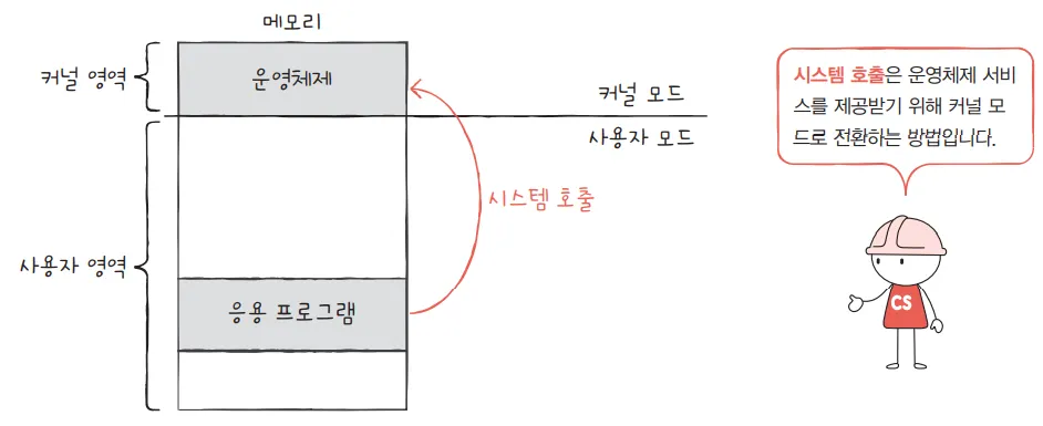 ⇒ 운영체제의 기능을 제공받기 위해서는 커널 영역에 적재된 운영체제 코드를 실행해야 하는데, 코드를 실행하기 위해서 시스템 콜 이라는 함수 형태의 인터페이스를 호출하게 된다.