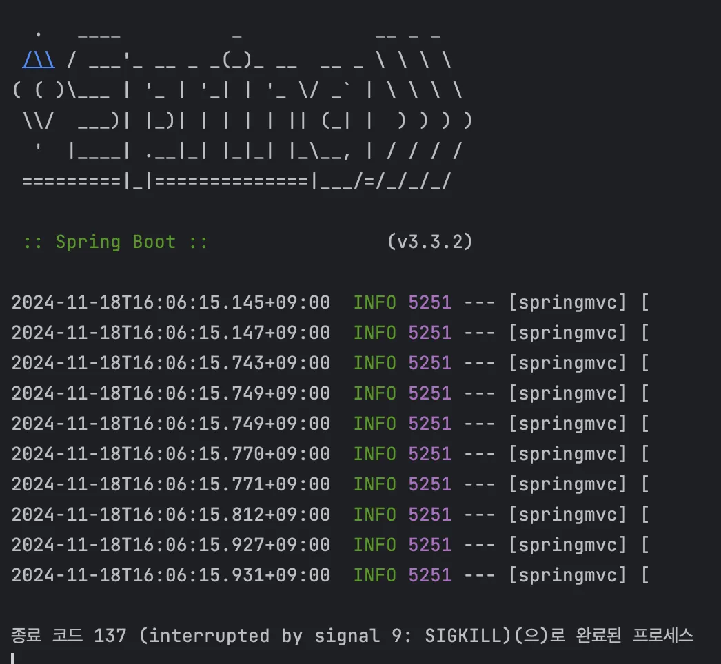 스프링부트 애플리케이션을 실행 → 일반적으로 8080포트에서 실행 → lsof -i :8080 명령어를 터미널에 입력하여 실행중인 스프링 프로그램 및 pid를 확인 → kill -9 pid 로 스프링을 종료 → 인텔리제이 IDE에서 확인 가능